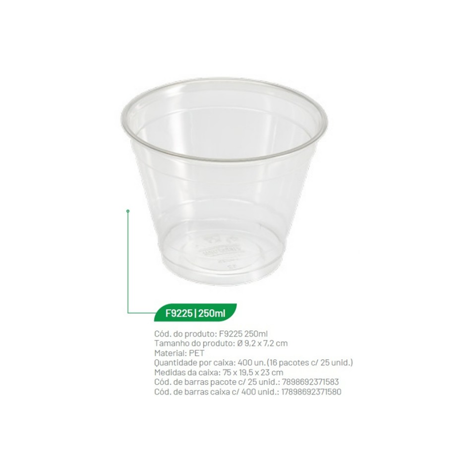 O Copo 250ml Fibraform F9225 é fabricado em PET Cristal de altíssima qualidade, com acabamento transparente e bordas arredondadas que oferecem conforto e segurança no consumo. Com design inteligente e moderno, proporciona maior resistência, firmeza e excelente apresentação para bebidas e sobremesas.