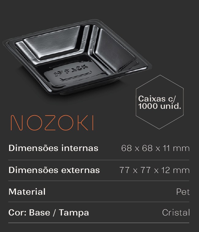 A Embalagem JF Pack Nozoki é um mini pote berço desenvolvido especialmente para servir shoyu, molhos e acompanhamentos individuais em restaurantes japoneses, deliverys e buffets orientais. Produzida em PET preto, garante ótima apresentação, higiene e praticidade no consumo.