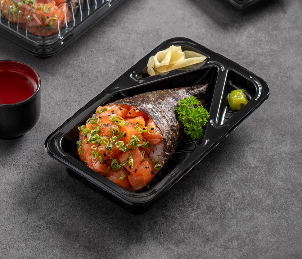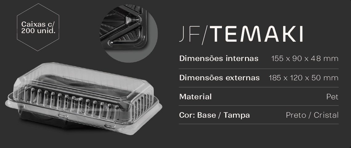 A Embalagem JF Pack Temaki é prática, resistente e sofisticada, ideal para servir e transportar temakis, mantendo a apresentação impecável e a higiene no consumo. Produzida em PET cristal com base preta, garante ótima visibilidade do produto e firmeza no empilhamento.