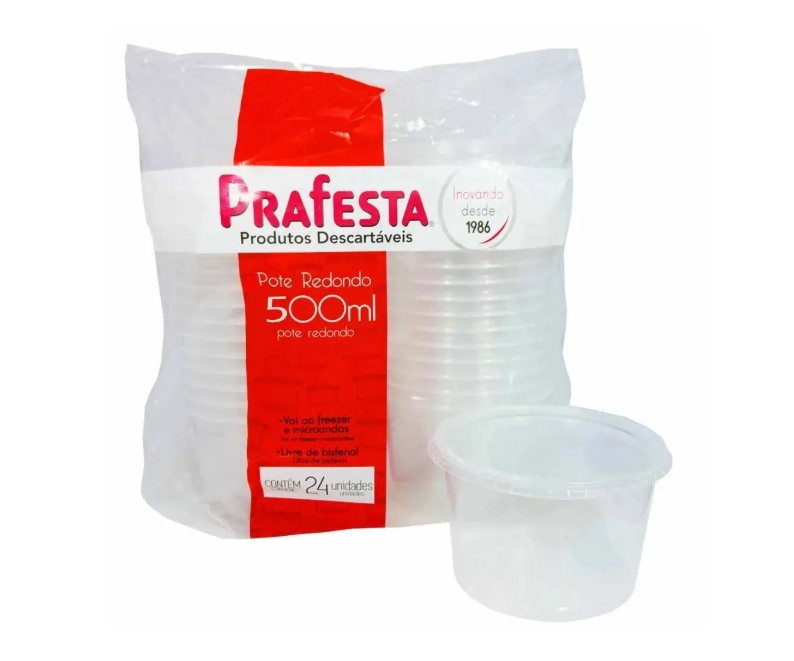 O Pote Redondo Prafesta 500ml é a embalagem ideal para acondicionar e transportar alimentos com praticidade, segurança e excelente apresentação. Fabricado em PET cristal transparente, oferece alta resistência e valoriza a aparência dos alimentos, transmitindo higiene e qualidade.