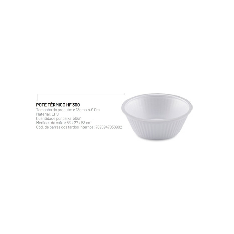 O Pote Térmico Fibraform HF300 foi desenvolvido para oferecer praticidade, resistência e conservação ideal dos alimentos. Produzido em isopor (EPS expandido) de alta qualidade, mantém a temperatura dos alimentos por mais tempo, sendo perfeito tanto para preparações quentes quanto frias.