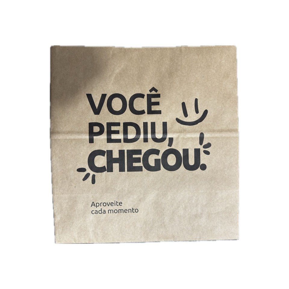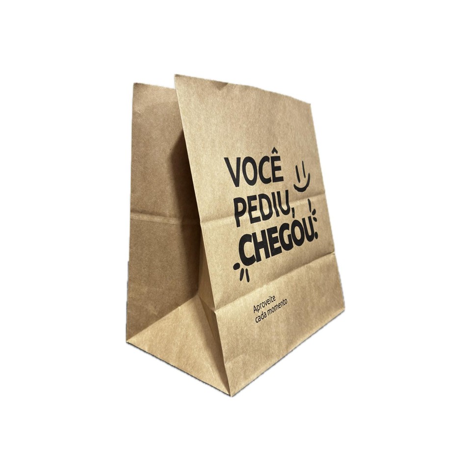 Tipo: Saco de papel kraft com fundo reforçado e estampa “Você Pediu Chegou”