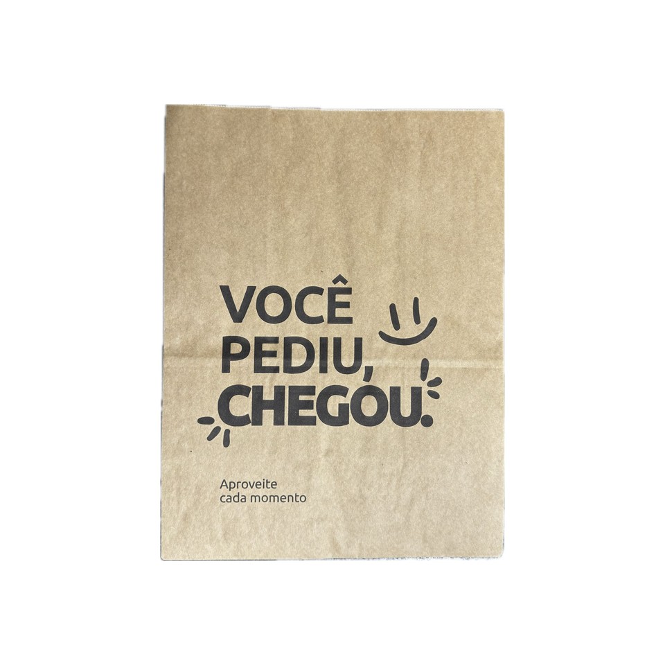 Tipo: Saco de papel kraft com fundo reforçado e estampa “Você Pediu Chegou”